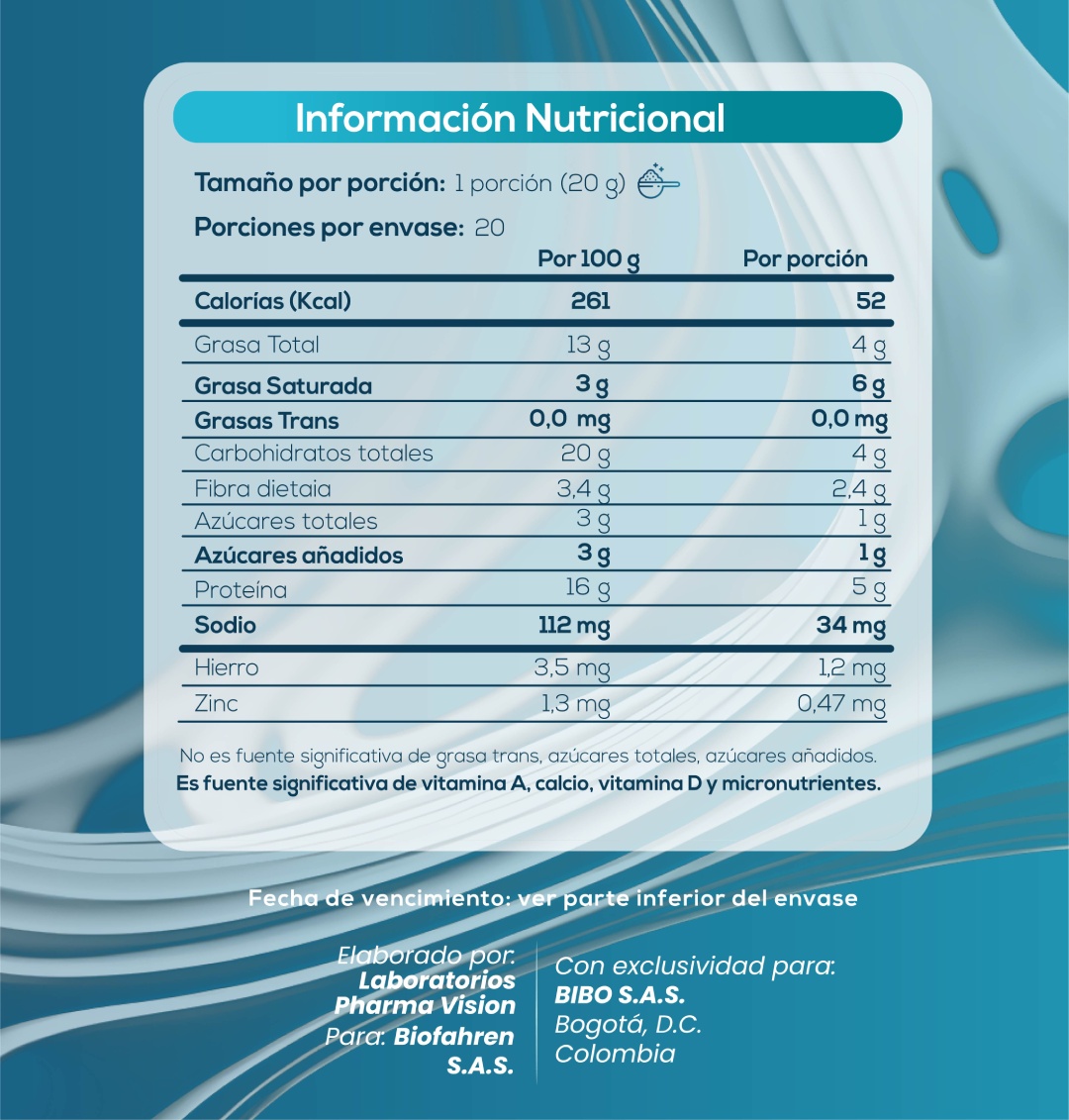 Alimento en polvo a base de proteína aislada de soya, avena, quinua, semilla de chía, linaza, moringa, psyllium, colágeno hidrolizado, calcio de coral, hoja de stevia molida, vitamina A,C y zinc.